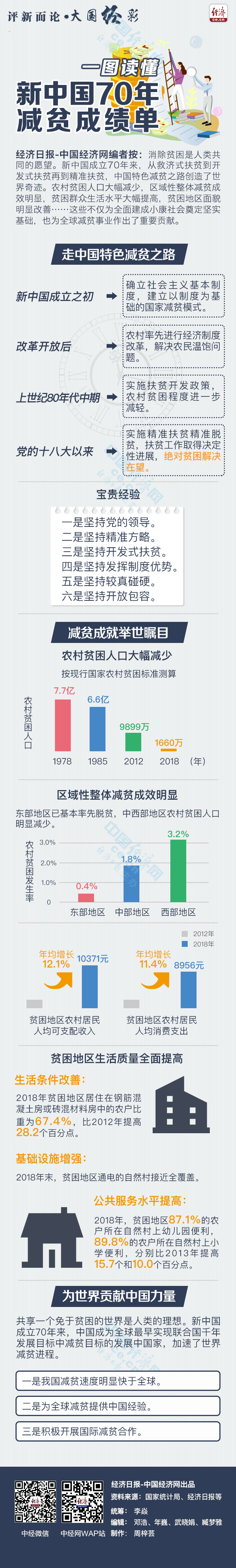 經(jīng)濟日報-中國經(jīng)濟網(wǎng)編者按:消除貧困是人類共同的愿望。新中國成立70年來,從救濟式扶貧到開發(fā)式扶貧再到精準(zhǔn)扶貧,中國特色減貧之路創(chuàng)造了世界奇跡。農(nóng)村貧困人口大幅減少,區(qū)域性整體減貧成效明顯,貧困群眾生活水平大幅提高,貧困地區(qū)面貌明顯改善……這些不僅為全面建成小康社會奠定堅實基礎(chǔ),也為全球減貧事業(yè)作出了重要貢獻。