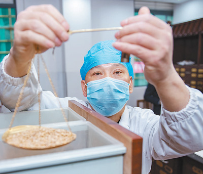 3月2日,福建省泉州市德化縣醫(yī)院的中藥師在根據(jù)處方調(diào)配中藥?! ∩塾褡?許華森攝影報道
