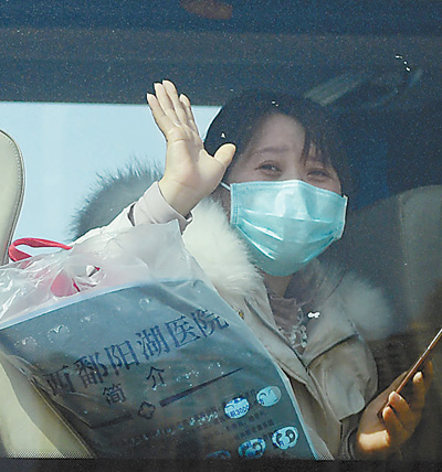 2月22日,江西中醫(yī)藥大學附屬醫(yī)院撫生院區(qū),11名此前由其他醫(yī)療機構轉入該院的新冠肺炎患者治愈出院,其中有8人在該院接受了中醫(yī)治療,3人接受中西醫(yī)結合治療。圖為出院的病人向醫(yī)護人員揮手告別?! r 雨攝(影像中國)