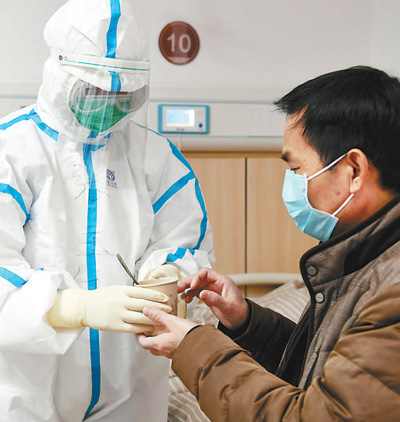 2月18日,在江西中醫(yī)藥大學附屬醫(yī)院撫生院區(qū)新冠肺炎患者的隔離病房內(nèi),護士將中藥湯劑端給患者?! r 雨攝(影像中國)