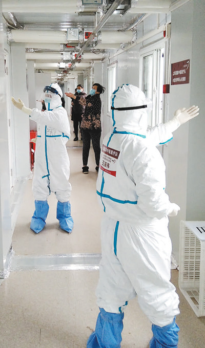 武漢雷神山醫(yī)院,上海支援湖北醫(yī)療隊的醫(yī)護人員在教患者按照“六字訣”中醫(yī)功法進行鍛煉?! 〗?龔亞斌攝影報道 版式設計:蔡華偉 |