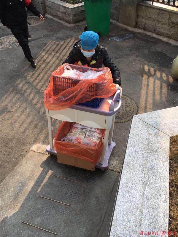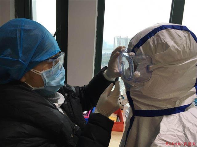 隔離病區(qū)里不僅有患者、醫(yī)生、護士還有病區(qū)保潔員。看起來不起眼的他們,同樣是最勇敢的逆行者。 “從我們隔離病區(qū)開始接收患者至今一個多月,保潔師傅高姐一直和我們一起?!蔽錆h市第四醫(yī)院古田院區(qū)感染病區(qū)18樓護士長歐陽斐說,一個多月來醫(yī)護人換已經(jīng)輪換到第三批,可高姐卻一直在這守著。 保潔員隔離病區(qū)工作37天 早晨6點,天剛亮,保潔員高水清就來到她工作的18樓隔離病區(qū)。做好清潔區(qū)的衛(wèi)生,再到食堂領(lǐng)取近40份患者的早餐。不到7點半,就和歐陽斐一同,準備進入污染區(qū)。 在歐陽斐的幫助下,她一層層穿上防護服。“高姐我再幫你檢查一遍,鞋套和隔離服之間不能有縫隙?!睔W陽斐一再叮囑,“護目鏡和鼻子間還有縫,我?guī)湍鷫|上點紙再貼上?!?/p> 嚴格按照病區(qū)三級防護著裝后,歐陽斐會在高水清隔離服上寫上“高姐”。 “我喜歡他們這么叫我,很親切,不生分?!备呓阋徊讲酵ㄟ^半污染區(qū)、進入污染區(qū)。