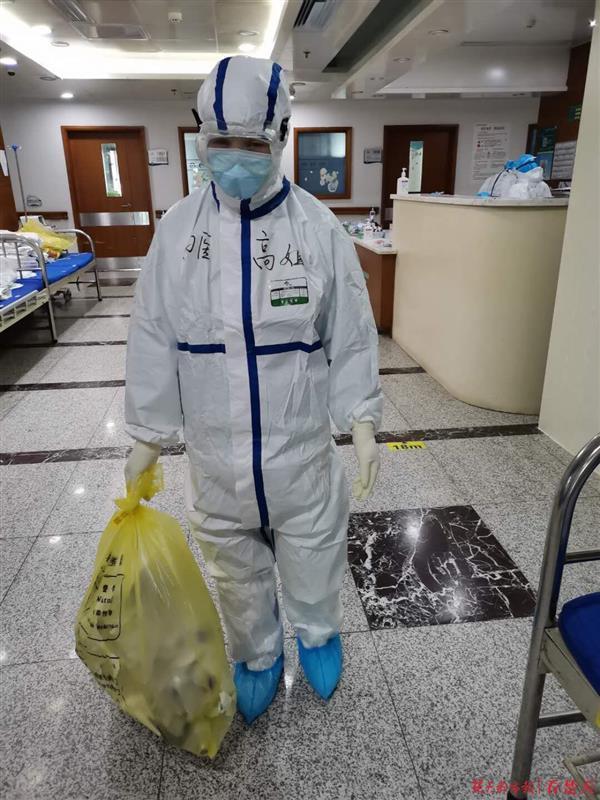 在這里,她的主要工作是負責患者生活垃圾的收集、清理和病區(qū)的保潔、消毒工作。當看到護士們特別忙碌時,她還會幫著給每位患者送早餐。 身形清瘦的高姐干起活來十分利索,來回穿梭于病區(qū),對所有病房的門把手、床頭柜、洗手臺、洗手間進行清潔消毒,病房和病區(qū)走廊的地拖干凈,逐一將14間病房的生活垃圾收集,并用護士長教她的環(huán)形打結(jié)法封口、打包,三次消毒后,集中放到醫(yī)療廢物暫存處。 每天上午做完這些工作,都需要2個多小時,才能出污染區(qū)。每天下午,還要進入隔離病區(qū)打掃。一天累計起來,高姐和許多醫(yī)護人員一樣,要在里面工作5個多小時。 “現(xiàn)在進入隔離病房做清潔,對我來說就像是換了套衣服在工作,沒那么怕了!因為他們把我保護得很好?!备呓闾寡?,每次進出隔離區(qū),護士們不僅會對她的著裝反復(fù)檢查,還會幫她在鼻子上涂壓瘡膏。“從大年初三到現(xiàn)在工作1個多月,目前身體還算不錯,臉上也沒有被口罩或是護目鏡壓破?!?/p>
