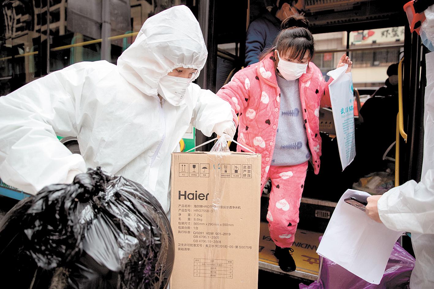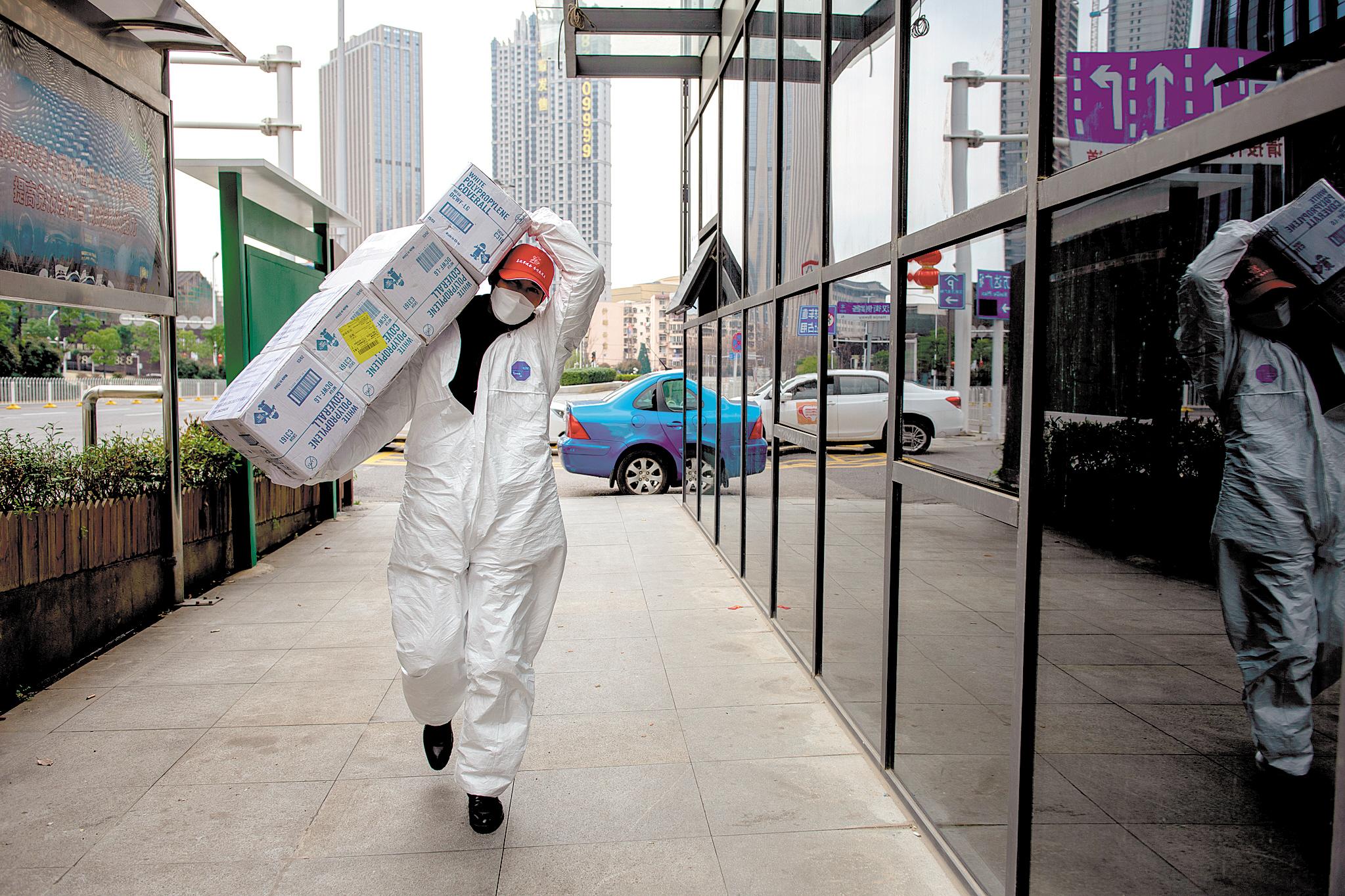 2月12日,武漢大學(xué)中南醫(yī)院,大學(xué)生志愿者轉(zhuǎn)運(yùn)醫(yī)療物資。