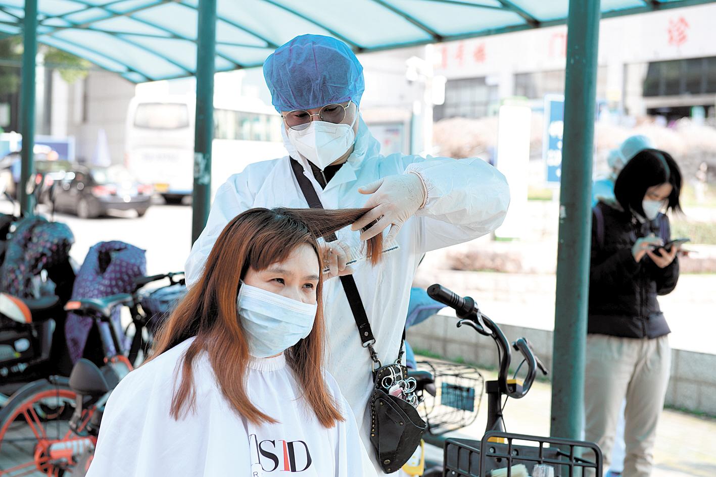 2月23日,椰島公司發(fā)型師給武漢大學(xué)中南醫(yī)院急診科近百名醫(yī)務(wù)人員義務(wù)剪發(fā)。