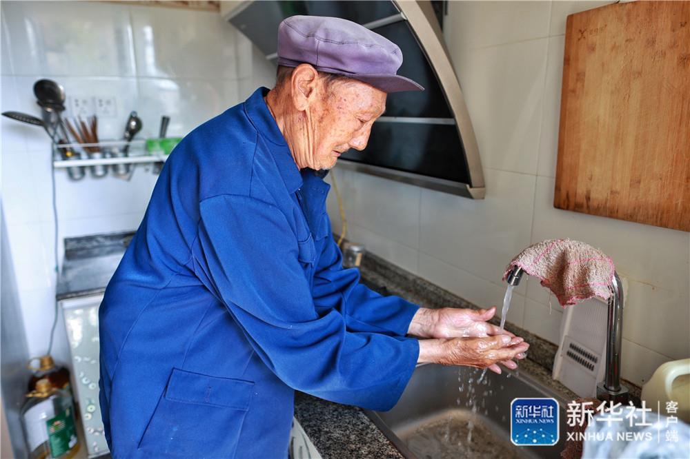 ↑石連英在柏楊林易地扶貧搬遷安置點家中洗手(8月3日攝)。劉續(xù) 攝