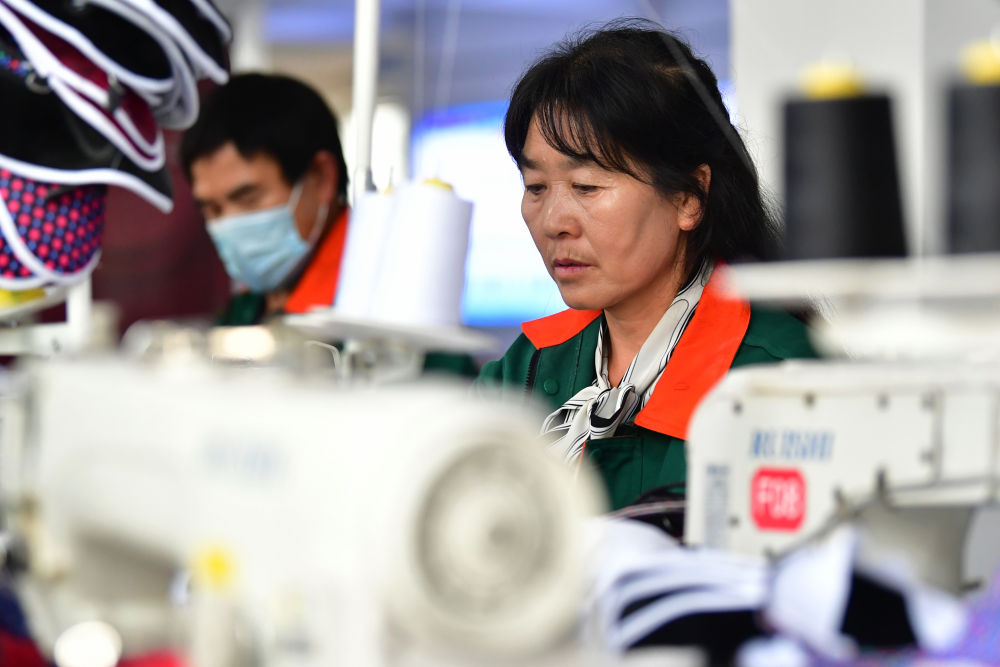 8月11日,在甘肅省臨夏回族自治州臨夏縣土橋鎮(zhèn),搬遷戶在布鞋加工扶貧車間工作。新華社記者 陳斌 攝