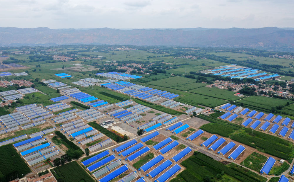 這是8月11日拍攝的甘肅省臨夏回族自治州臨夏縣易地扶貧搬遷后續(xù)產(chǎn)業(yè)發(fā)展日光溫室建設(shè)項目(無人機照片)。新華社記者 邢廣利 攝