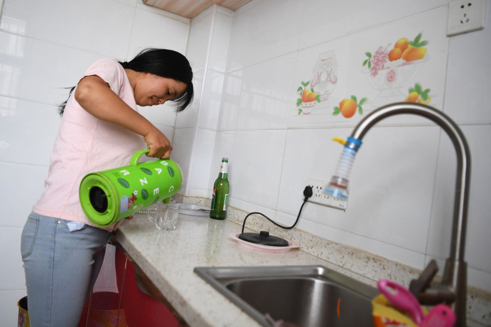 8月11日,在甘肅省臨夏回族自治州臨夏縣土橋鎮(zhèn)易地扶貧搬遷安置點,搬遷戶楊喜梅在家中倒水。新華社記者 陳斌 攝