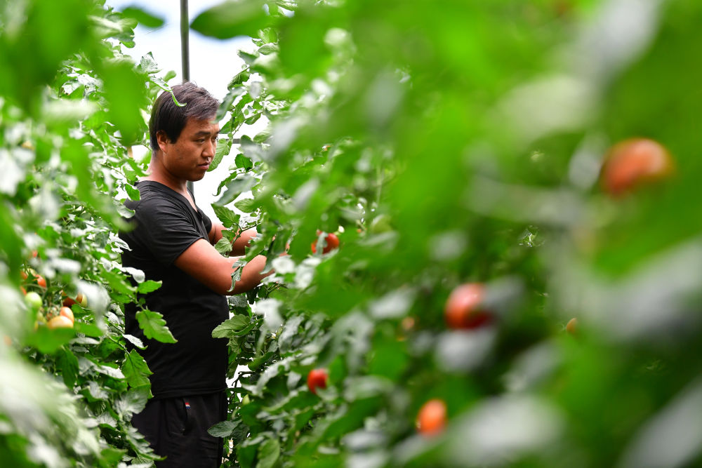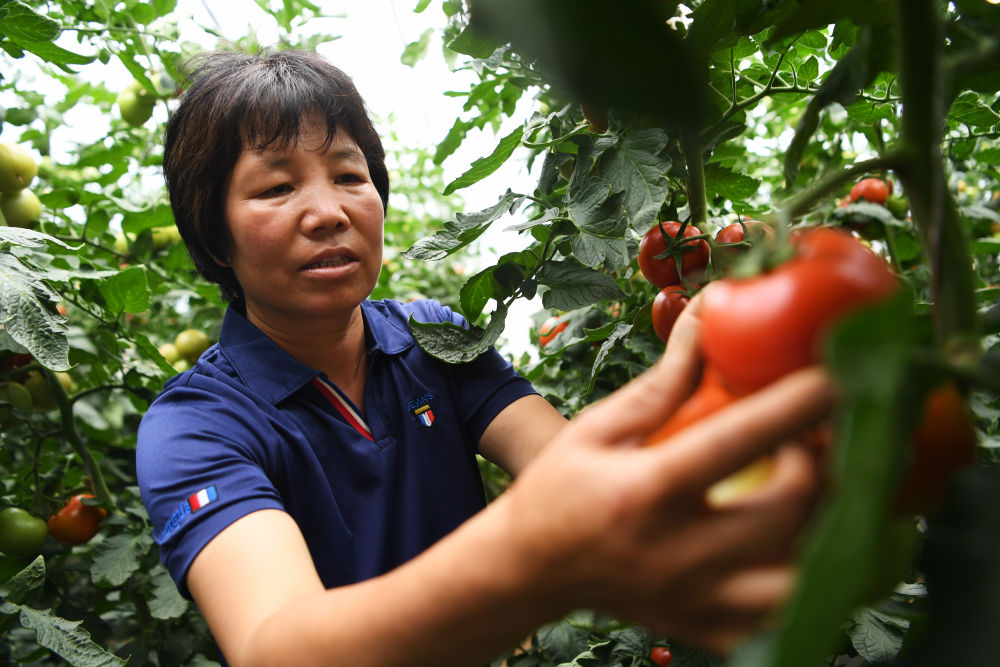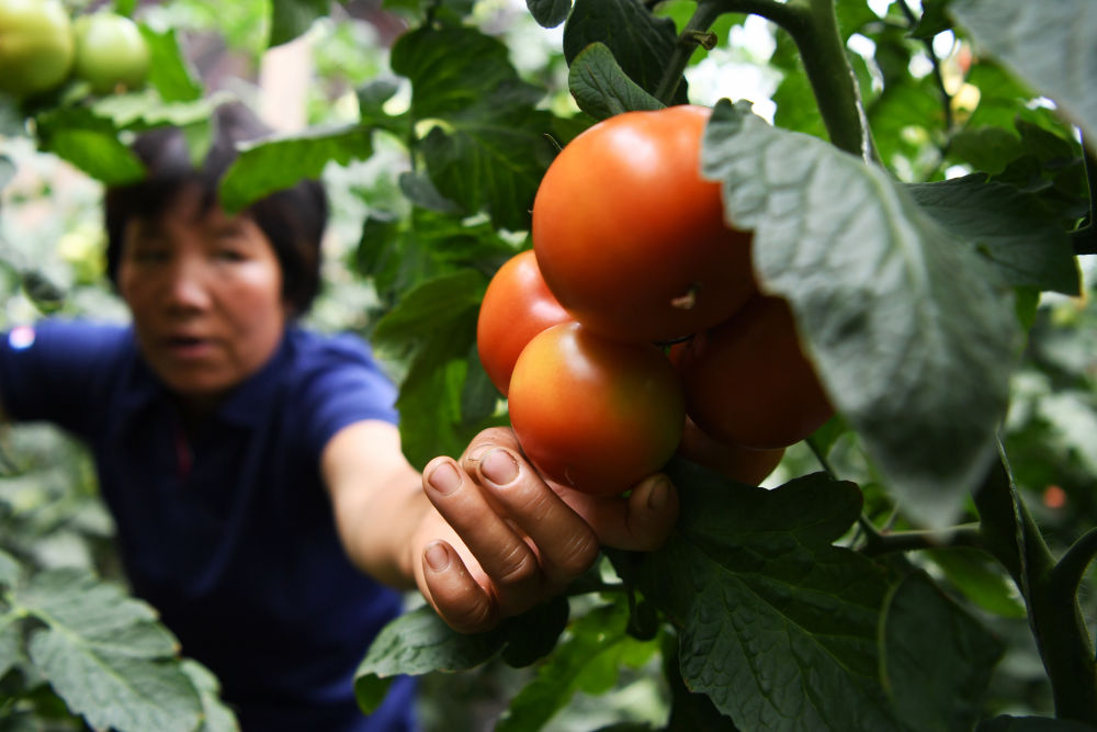 8月11日,在甘肅省臨夏回族自治州臨夏縣先鋒鄉(xiāng)前韓村,搬遷戶韓貴蘭在日光溫室內(nèi)采摘西紅柿。 近年來,甘肅省臨夏回族自治州臨夏縣把易地扶貧搬遷作為打贏脫貧攻堅戰(zhàn)的重要任務(wù),科學(xué)推進易地扶貧搬遷和脫貧攻堅工作。為了讓搬遷群眾能夠安居樂業(yè),當?shù)卣⒅胤龀趾罄m(xù)產(chǎn)業(yè)發(fā)展,引導(dǎo)搬遷群眾發(fā)展日光溫室、布鞋加工、觀光農(nóng)業(yè)、特色種養(yǎng)殖等產(chǎn)業(yè),幫助搬遷群眾實現(xiàn)就近就業(yè)、拓寬增收渠道,確保搬遷群眾“搬得出、穩(wěn)得住、有事做、能致富”。新華社記者 陳斌 攝