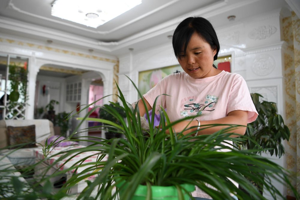 8月11日,在甘肅省臨夏回族自治州臨夏縣土橋鎮(zhèn)易地扶貧搬遷安置點,搬遷戶楊喜梅在家中收拾家務(wù)。新華社記者 陳斌 攝