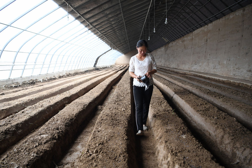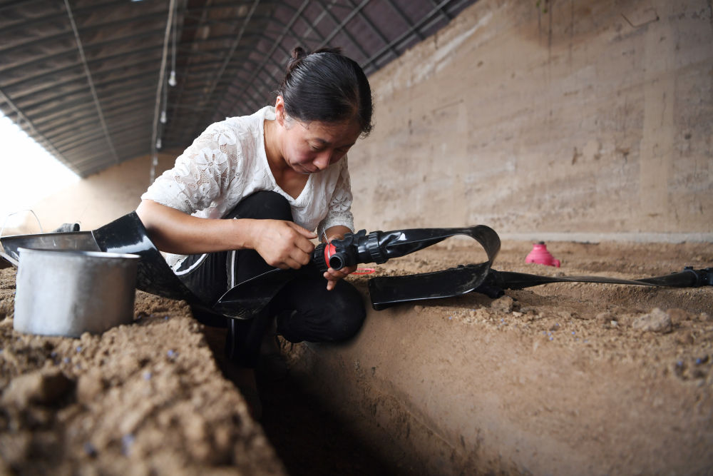 8月11日,在甘肅省臨夏回族自治州臨夏縣先鋒鄉(xiāng)前韓村,搬遷戶朱懷蘭在日光溫室內(nèi)勞作。新華社記者 陳斌 攝