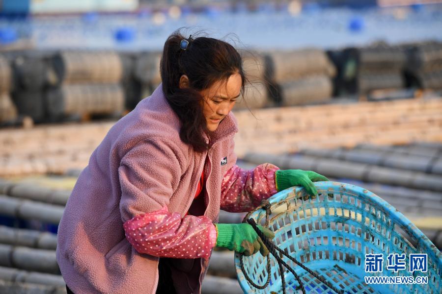 2月4日,巴木玉布木在漁排上忙碌。新華社記者 姜克紅 攝 成功脫貧的“春運母親”巴木玉布木,又有了新的夢想。過完彝族新年后,2月1日,她從四川涼山老家來到位于福建沿海的霞浦縣,與丈夫巫其石且和丈夫的妹妹、妹夫會合,在那里開啟漁排海參養(yǎng)殖的新生活。 福建省霞浦縣是海產(chǎn)大縣,眼下正是海參生長旺季。從霞浦縣溪南鎮(zhèn)西安碼頭乘快艇大約5分鐘就來到了巴木玉布木工作的漁排。漁排上,巴木玉布木與丈夫正俯身將一籠籠海參提起打開,然后投入海帶、小魚料,再關上蓋子放入水中。 從大山來到大海,幾天下來,從未在海上生活的巴木玉布木與丈夫逐漸適應了腳下漁排的搖晃和強勁的海風,養(yǎng)殖海參的工作也越來越熟練。他們每天5點多起床備料,約7點開始喂養(yǎng)海參,喂完1400余籠海參一般要忙到中午。辛勤的勞作可以給夫婦二人每月帶來一萬多元的收入。