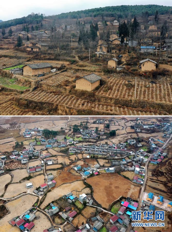 拼版照片:上圖是巴木玉布木童年住過的村莊(1月21日攝);下圖是她現(xiàn)在居住的桃園村(1月21日攝)。新華社記者 李思佳 攝 巴木玉布木的家鄉(xiāng)大涼山,是我國深度貧困地區(qū)。經(jīng)過8年多的精準扶貧,涼山州累計減貧105.2萬人、2072個貧困村全部退出、11個貧困縣全部摘帽,區(qū)域性整體貧困和絕對貧困問題全面消除。廣大貧困群眾過上了“睡有床鋪、衣有儲柜、炊有灶臺、餐有桌凳、洗有熱水、烤有火爐、娛有電視、包里有錢、出門有硬化路”的新生活。 如今的桃園村,通了路、通了電、通了網(wǎng)、通了自來水,和巴木玉布木一樣,村里75戶建檔立卡貧困戶蓋了房、增了收,孩子們上了學。