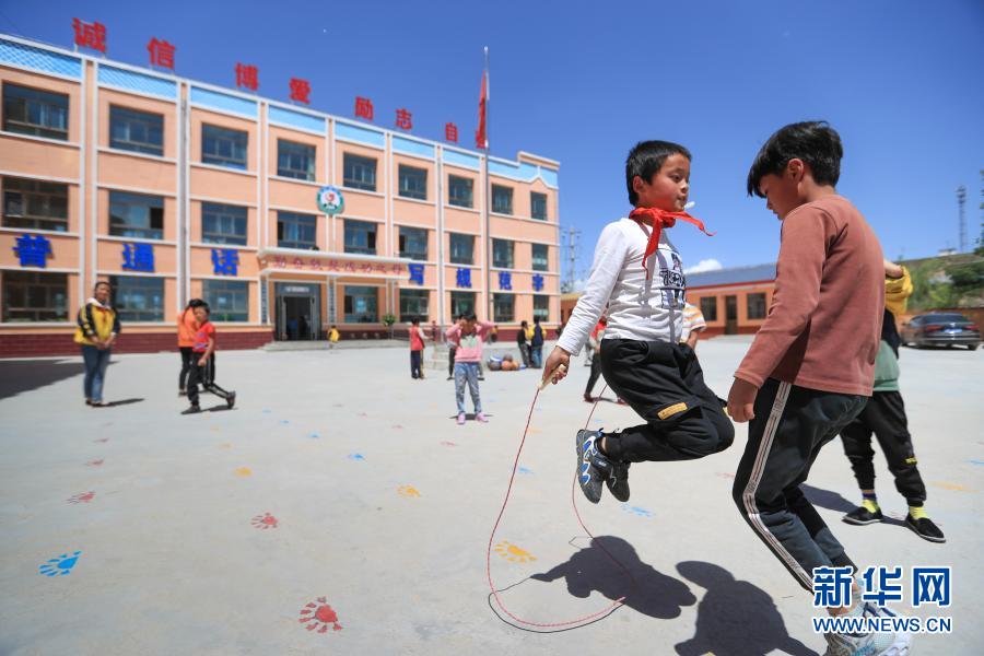 2020年5月29日,甘肅省臨夏回族自治州東鄉(xiāng)族自治縣龍泉鎮(zhèn)拱北灣小學(xué)學(xué)生馬有蘇夫(前左)和同學(xué)跳繩。新華社記者 馬希平 攝
