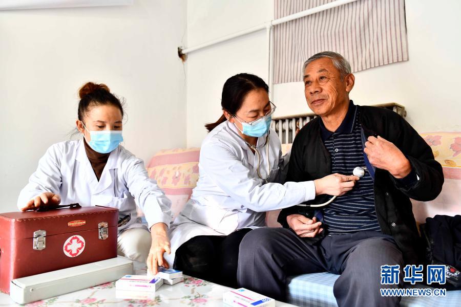 2020年11月11日,在山東省濰坊市寒亭區(qū)寒亭街道東院社區(qū),衛(wèi)生室醫(yī)生王紅霞(中)為村民張勇臣看病。寒亭區(qū)探索實(shí)施醫(yī)保服務(wù)下沉舉措,構(gòu)建起覆蓋全區(qū)基層醫(yī)療機(jī)構(gòu)的醫(yī)保服務(wù)下沉網(wǎng)絡(luò),讓群眾在家門口便捷地享受醫(yī)保紅利。新華社記者 郭緒雷 攝