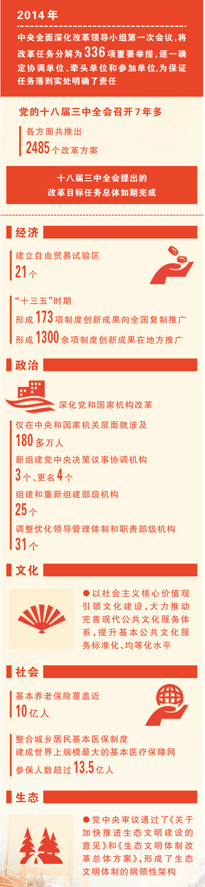 中國(guó)(廣西)自由貿(mào)易試驗(yàn)區(qū)欽州港片區(qū)的集裝箱碼頭?! ⌒氯A社記者 曹祎銘攝 2013年11月9日至12日,黨的十八屆三中全會(huì)在北京舉行。 全會(huì)聽取和討論了習(xí)近平總書記受中央政治局委托作的工作報(bào)告,審議通過了《中共中央關(guān)于全面深化改革若干重大問題的決定》。習(xí)近平總書記就《決定(討論稿)》向全會(huì)作了說明。 這是一份具有里程碑意義的宣言書,對(duì)中國(guó)走什么路、向何處去這個(gè)帶有方向性、戰(zhàn)略性的重大問題作出了旗幟鮮明的回答:高舉改革開放旗幟、努力開拓中國(guó)特色社會(huì)主義事業(yè)更加廣闊的前景。 這是一份具有劃時(shí)代意義的藍(lán)圖,對(duì)在新的歷史起點(diǎn)上全面深化改革作出戰(zhàn)略部署,在理論上有一系列重大創(chuàng)新,在實(shí)踐上有一系列重大突破,為實(shí)現(xiàn)中華民族偉大復(fù)興的中國(guó)夢(mèng),勾勒出改革路線圖和時(shí)間表。 新世紀(jì)新階段,改革開放航船,沿著黨的十一屆三中全會(huì)以來開辟的正確航道,又一次揚(yáng)帆起航。 宏偉壯麗的改革事業(yè)到了關(guān)鍵時(shí)刻 看似尋常最奇崛,成如容易卻艱辛。 時(shí)間回溯到2013年金秋。 此時(shí)的中國(guó),再次來到了事關(guān)前途命運(yùn)的歷史關(guān)口。經(jīng)濟(jì)長(zhǎng)期高速增長(zhǎng)過程中積累的一系列深層次矛盾不斷積聚,舊的問題解決了,新的問題又產(chǎn)生,必須在更多領(lǐng)域、更深層次全面深化改革。 ——全面建成小康社會(huì)、加快推進(jìn)社會(huì)主義現(xiàn)代化的宏偉藍(lán)圖,要求全面深化改革; ——堅(jiān)持和發(fā)展中國(guó)特色社會(huì)主義,要求全面深化改革; ——解決中國(guó)發(fā)展面臨的一系列突出矛盾和挑戰(zhàn),實(shí)現(xiàn)經(jīng)濟(jì)社會(huì)持續(xù)健康發(fā)展,要求全面深化改革; ——順應(yīng)時(shí)代潮流,滿足人民期待,保持黨和國(guó)家生機(jī)活力,要求全面深化改革…… 時(shí)代課題,擺在新一屆黨中央領(lǐng)導(dǎo)集體面前。 廣東、河北、甘肅、海南、天津、四川、湖北、遼寧、湖南……黨的十八大以來,習(xí)近平總書記調(diào)研的足跡遍及大江南北,遍及社區(qū)、鄉(xiāng)村、企業(yè)、學(xué)校??倳浺陨铄涞亩床炝透呶萁驳膽?zhàn)略眼光,提出了全面深化改革需要調(diào)查研究的6個(gè)重大問題—— 進(jìn)一步形成全國(guó)統(tǒng)一的市場(chǎng)體系,形成公平競(jìng)爭(zhēng)的發(fā)展環(huán)境;進(jìn)一步增強(qiáng)經(jīng)濟(jì)發(fā)展活力,為實(shí)現(xiàn)經(jīng)濟(jì)持續(xù)健康發(fā)展提供不竭動(dòng)力;進(jìn)一步提高宏觀調(diào)控水平,提高政府效率和效能;進(jìn)一步增強(qiáng)社會(huì)發(fā)展活力,促進(jìn)社會(huì)和諧穩(wěn)定;進(jìn)一步實(shí)現(xiàn)社會(huì)公平正義,通過制度安排更好保障人民群眾各方面權(quán)益;進(jìn)一步提高黨的領(lǐng)導(dǎo)水平和執(zhí)政能力,充分發(fā)揮黨總攬全局、協(xié)調(diào)各方的作用。 這6個(gè)重要課題,直指中國(guó)改革發(fā)展的關(guān)鍵。 1978年,黨的十一屆三中全會(huì)如平地驚雷,打破堅(jiān)冰,開啟波瀾壯闊的改革開放航程。 2013年,宏偉壯麗的改革事業(yè)又一次到了關(guān)鍵時(shí)刻,決定著中華民族復(fù)興偉業(yè)的圓夢(mèng)藍(lán)圖徐徐展開。 為謀定未來作出全面系統(tǒng)的戰(zhàn)略部署 2013年11月12日,中國(guó)再次吸引了世界關(guān)注的目光。 下午3時(shí),黨的十八屆三中全會(huì)舉行閉幕會(huì),出席全會(huì)的中央委員經(jīng)表決,一致通過了《中共中央關(guān)于全面深化改革若干重大問題的決定》。 當(dāng)習(xí)近平總書記宣布《決定》通過時(shí),會(huì)場(chǎng)上響起了熱烈的掌聲。 翻開這份決定,從以經(jīng)濟(jì)體制改革為主到全面深化經(jīng)濟(jì)、政治、文化、社會(huì)、生態(tài)文明體制和黨的建設(shè)制度改革,是新中國(guó)成立以來最為全面系統(tǒng)的改革部署。 “相比過去,新時(shí)代改革開放具有許多新的內(nèi)涵和特點(diǎn),其中很重要的一點(diǎn)就是制度建設(shè)分量更重,改革更多面對(duì)的是深層次體制機(jī)制問題,對(duì)改革頂層設(shè)計(jì)的要求更高,對(duì)改革的系統(tǒng)性、整體性、協(xié)同性要求更強(qiáng),相應(yīng)地建章立制、構(gòu)建體系的任務(wù)更重?!绷?xí)近平總書記鮮明指出新時(shí)代改革開放的特點(diǎn)。 十八屆三中全會(huì)把國(guó)家治理體系和治理能力建設(shè)擺到更加突出的位置,通過加強(qiáng)頂層設(shè)計(jì)、系統(tǒng)配套、整體推進(jìn),為謀定未來作出了全面系統(tǒng)的戰(zhàn)略部署。 ——《決定》明確了全面深化改革的總目標(biāo),體現(xiàn)了中國(guó)共產(chǎn)黨人的政治勇氣:完善和發(fā)展中國(guó)特色社會(huì)主義制度,推進(jìn)國(guó)家治理體系和治理能力現(xiàn)代化。 ——《決定》指出了全面深化改革的目的,體現(xiàn)了中國(guó)共產(chǎn)黨人的必勝信心:進(jìn)一步解放思想、解放和發(fā)展社會(huì)生產(chǎn)力、解放和增強(qiáng)社會(huì)活力。 ——《決定》部署了全面深化改革的重點(diǎn),體現(xiàn)了中國(guó)共產(chǎn)黨人的堅(jiān)強(qi