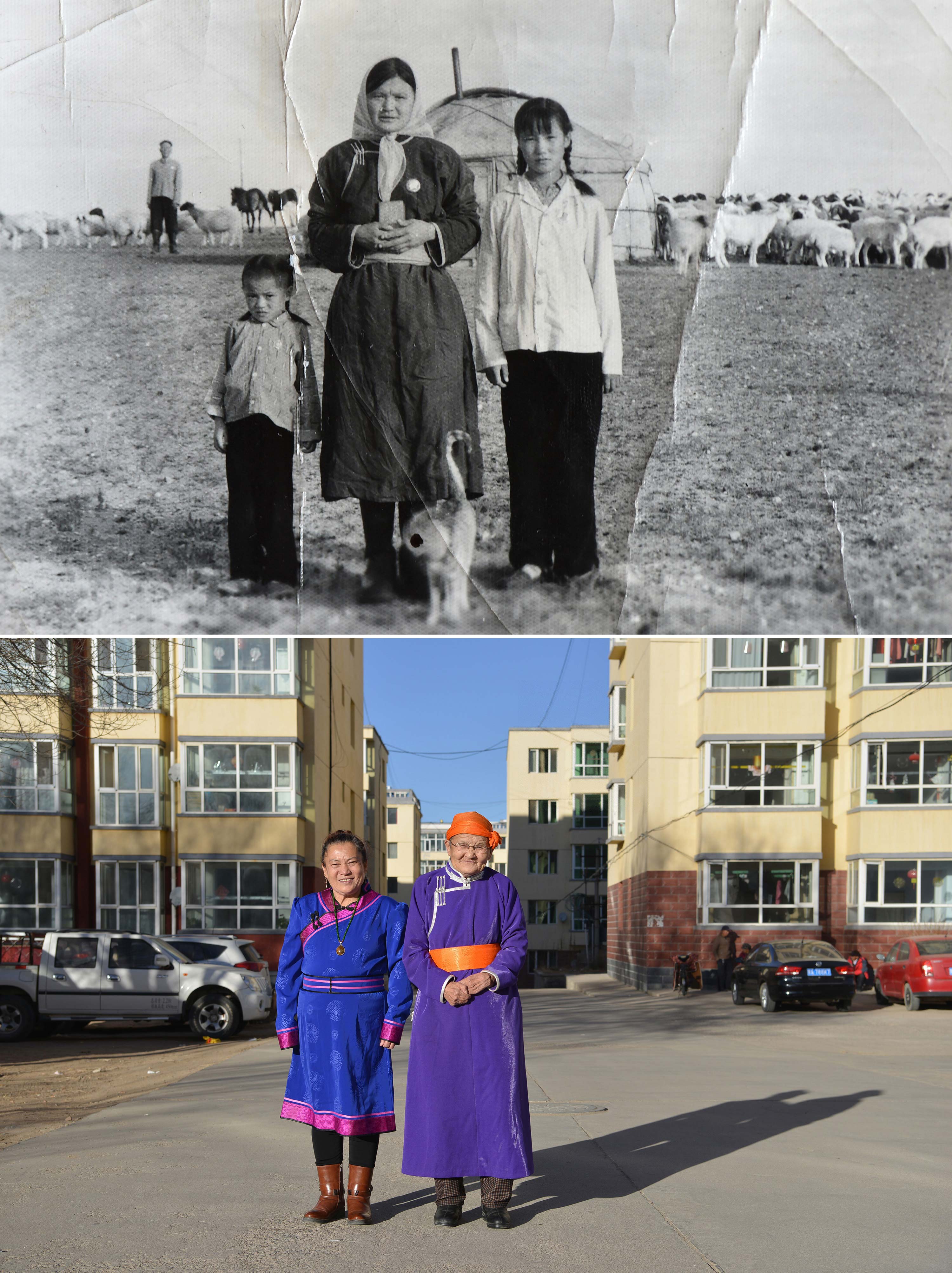 △上圖:在內(nèi)蒙古四子王旗腦木更蘇木烏蘭希熱嘎查,都貴瑪(中)和女兒查干朝魯(左)在她們居住的蒙古包前合影;下圖:2018年在內(nèi)蒙古四子王旗烏蘭花鎮(zhèn),76歲的都貴瑪(右)和女兒查干朝魯(左)在自家樓下合影。
