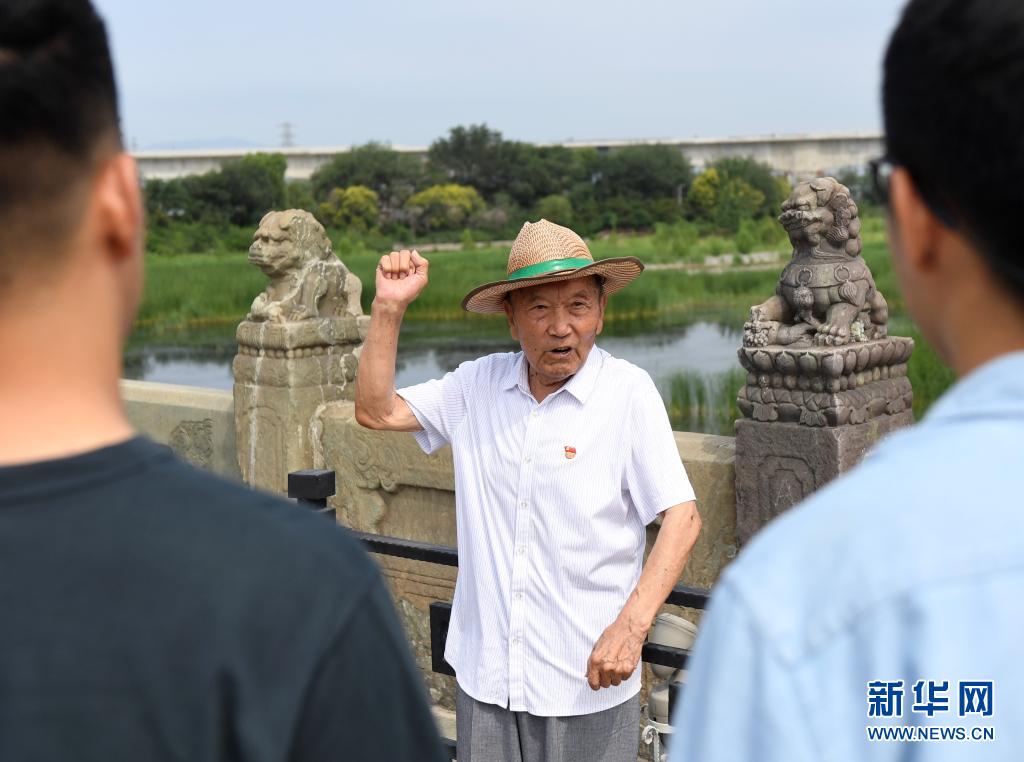 7月5日,鄭福來老人在北京盧溝橋?yàn)橛慰椭v述抗戰(zhàn)歷史。新華社記者 張晨霖 攝 頭頂遮陽(yáng)帽,漫步盧溝橋,觸摸石獅子,作為“七七事變”的親歷者,90歲的“光榮在黨50年”紀(jì)念章獲得者、“時(shí)代楷?!睒s譽(yù)獲得者鄭福來老人,為了讓后人銘記那段刻骨銘心的歷史,仍堅(jiān)持在炎炎夏日中,向來往的游客介紹他眼中的抗戰(zhàn)故事。 84年前,“七七事變”爆發(fā),中華民族遭受了前所未有的劫難?!拔彝辽灵L(zhǎng)在盧溝橋,一輩子就生活在這兒?!咂呤伦儭臅r(shí)候我6歲,那時(shí)慘烈的景象我到現(xiàn)在還記憶猶新?!编嵏碚驹跇蛑醒脒h(yuǎn)眺著宛平城門回憶道,那個(gè)晚上,他在密集的槍炮聲中驚醒?!拔壹揖妥≡诒R溝橋西,離那兒不足50米。那天晚上,震耳欲聾的炮彈聲差不多響了一宿。頭一天還跟我一起玩兒的小伙伴,當(dāng)晚就被落在家門前的炮彈給炸死了!”