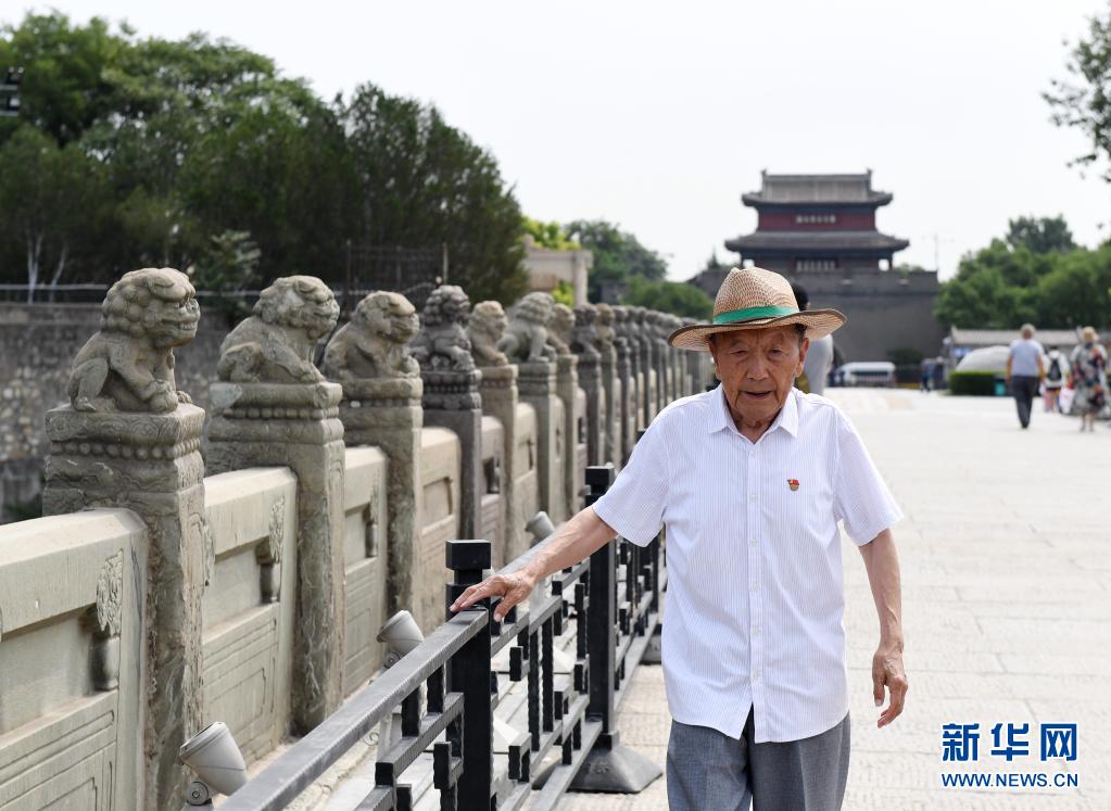 7月5日,鄭福來老人走在北京盧溝橋上。新華社記者 張晨霖 攝 說著過去的經(jīng)歷,老人聲音有些哽咽?!爱?dāng)時(shí)駐守在盧溝橋附近宛平城的是國(guó)民革命軍第29軍,那晚過后,很多戰(zhàn)士都犧牲了。”鄭福來說,就在自己平時(shí)常去玩耍的一小片松樹林里,擺放了很多戰(zhàn)士的遺體。盡管那時(shí)候他還小,但不屈的抗戰(zhàn)精神早已深深烙在他的腦海里?!皡羌业亩濉⑷未笞?,還有很多其他鄉(xiāng)親被侵略者殘忍殺害了,盧溝橋和宛平城門上的彈痕就是見證?!?/p> 受到抗日戰(zhàn)士們英勇氣概的強(qiáng)烈感染,鄭福來在心中埋下了革命的種子。他18歲參加革命工作,不久后正式加入中國(guó)共產(chǎn)黨,此后還以盧溝橋鎮(zhèn)政府民政委員的身份前往天安門廣場(chǎng)參加開國(guó)大典。從此,他的全部青春完全凝結(jié)在首都的建設(shè)中。1952年當(dāng)選為盧溝橋鎮(zhèn)第一任鎮(zhèn)長(zhǎng),同年接待美國(guó)記者愛潑斯坦,1959年帶著群眾為首都十大建筑供應(yīng)砂石料……在很多重大歷史的進(jìn)程中,都有他的身影。