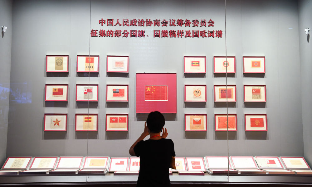 ↑一名參觀者在參觀“中國人民政治協(xié)商會(huì)議籌備委員會(huì)征集的部分國旗、國徽稿樣及國歌詞譜”。 二 成立中華人民共和國 進(jìn)行社會(huì)主義革命和建設(shè)