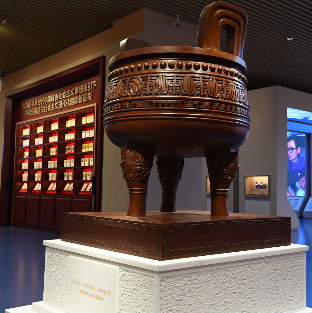 ↑小康寶鼎。 展覽使人們深刻認(rèn)識到 紅色政權(quán)來之不易 新中國來之不易 中國特色社會(huì)主義來之不易 展覽使人們深刻認(rèn)識到 中國共產(chǎn)黨為什么能 馬克思主義為什么行 中國特色社會(huì)主義為什么好