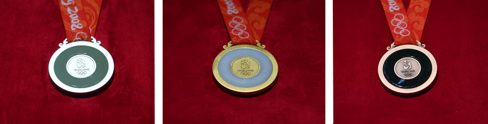 ↑北京奧運(yùn)會(huì)金、銀、銅獎(jiǎng)牌。