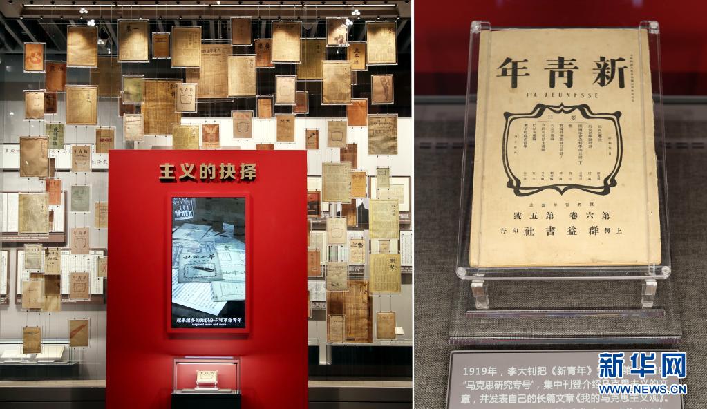 這是6月1日在上海的中共一大紀(jì)念館拍攝的大型立體式視覺(jué)置景“主義的抉擇”,100件五四運(yùn)動(dòng)前后傳播馬克思主義、社會(huì)主義的報(bào)紙雜志,錯(cuò)落陳列在玻璃墻上。其中,《新青年》第6卷第5號(hào)“馬克思研究專(zhuān)號(hào)”在前端“高光”展示,這期“專(zhuān)號(hào)”標(biāo)志著馬克思主義在中國(guó)的傳播進(jìn)入了較為系統(tǒng)的階段。新華社記者 劉穎 攝