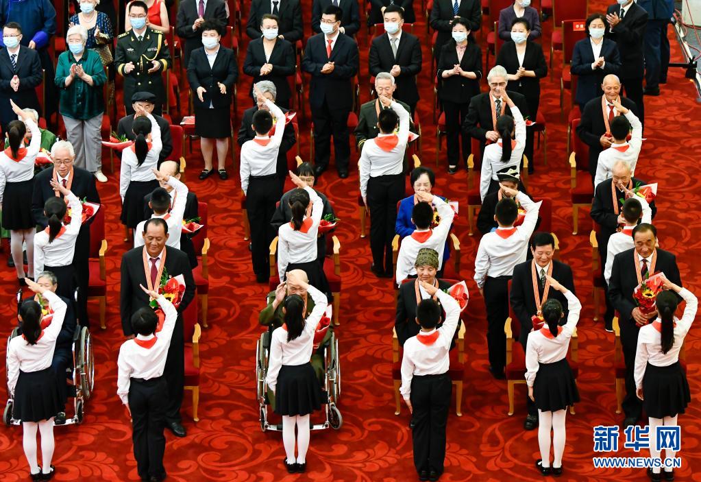 6月29日,慶祝中國(guó)共產(chǎn)黨成立100周年“七一勛章”頒授儀式在北京人民大會(huì)堂金色大廳隆重舉行。這是少先隊(duì)員向勛章獲得者獻(xiàn)花,敬禮致意。新華社記者 高潔 攝