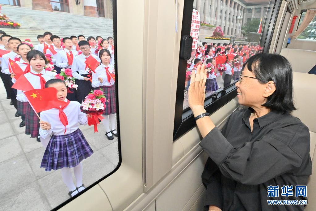 6月29日,慶祝中國(guó)共產(chǎn)黨成立100周年“七一勛章”頒授儀式在北京人民大會(huì)堂金色大廳隆重舉行。這是“七一勛章”獲得者張桂梅向青少年致意。新華社記者 岳月偉 攝