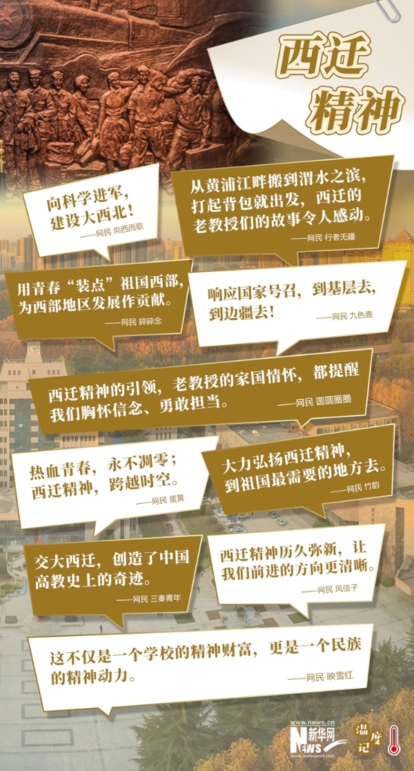 “永遠向上的精神火焰”系列網評之四十一: 在西安交通大學西遷博物館里,一張粉紅色的火車票極其別致。火車票上面印著書本、墨水瓶,還有一列正在行進的火車。正是這張火車票開啟了交大西遷的征程。 1955年,黨中央、國務院從國家戰(zhàn)略布局和西部工業(yè)發(fā)展需要出發(fā),作出了交通大學內遷西安的決定。從黃浦江畔搬到渭水之濱,交大師生響應國家號召,“打起背包就出發(fā)”,舍小家為大家。至1956年9月,包括815名教職工、3900余名學生在內的6000多名交大人匯聚西安,開啟了一段艱苦奮斗的崢嶸歲月。 60余年,一代代交大人在一片荒涼的黃土地上甘于寂寞、樂于奉獻,用激情、熱血和青春芳華,鑄就了中國高等教育史上戰(zhàn)略布局調整的成功范例,并孕育和形成了西遷精神,這不僅是一個學校的精神財富,更是一個民族的精神動力。 “西遷精神歷久彌新,讓我們前進的方向更清晰。”“西遷精神的引領,老教授的家國情懷,都提醒我們胸懷信念、勇敢擔當?!薄瓘木W民們的留言中,我們讀出了一種精神的寶貴和傳承。到黨和國家最需要的地方去!今天,越來越多當代青年人接過歷史的接力棒,主動選擇到基層去、到邊疆去,為西部發(fā)展、國家建設貢獻智慧和力量,用實際行動譜寫著一個又一個新時代的西遷故事。(文字:董璐 海報設計:王曄)