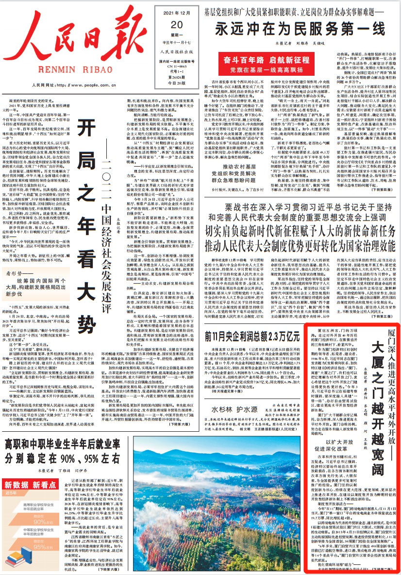 12月20日,《人民日報(bào)》頭版刊發(fā)長篇通訊《廈門深入推進(jìn)更高水平對外開放——大廈之門越開越寬闊》,聚焦廈門經(jīng)濟(jì)特區(qū)建設(shè)40周年,點(diǎn)贊廈門以擴(kuò)大開放促進(jìn)深化改革、以更高水平開放推動(dòng)經(jīng)濟(jì)社會(huì)高質(zhì)量發(fā)展、以更高水平開放服務(wù)和融入構(gòu)建新發(fā)展格局。