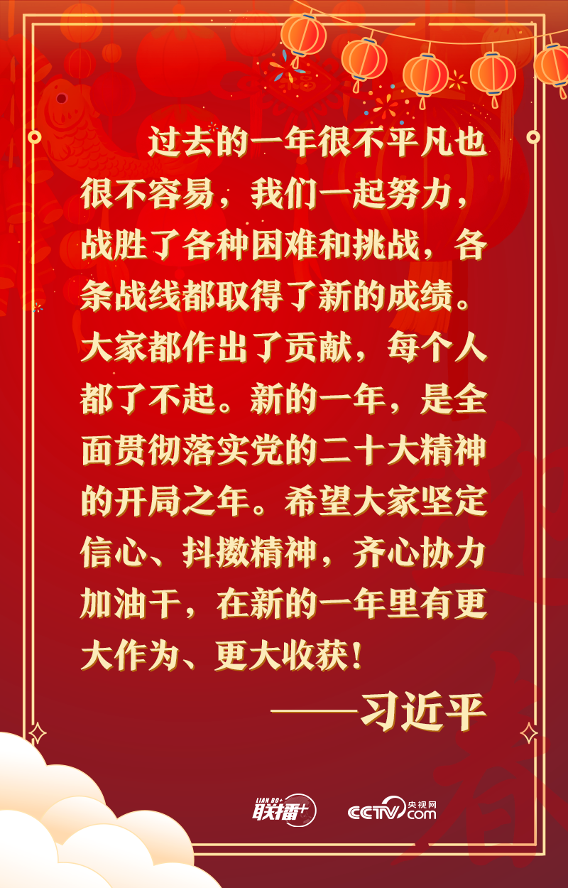 辭舊送吉虎,迎新接玉兔。春節(jié)前夕,習(xí)近平總書記在人民大會堂東大廳,同黑龍江、福建、新疆、河南、北京、四川等地基層干部群眾視頻連線,看望慰問基層干部群眾,向全國各族人民致以新春的美好祝福。