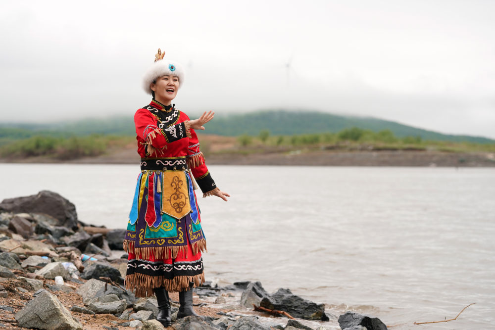 在黑龍江省同江市街津口赫哲族鄉(xiāng)漁業(yè)村附近的黑龍江江畔,劉蕾展示一段赫哲族歌舞(2022年5月21日攝)。新華社記者 王建威 攝