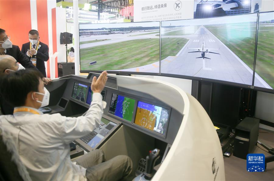 2022年11月5日,在第五屆進(jìn)博會技術(shù)裝備展區(qū)霍尼韋爾展臺,參觀者在工作人員指導(dǎo)下體驗?zāi)M飛行。新華社記者 張可任 攝