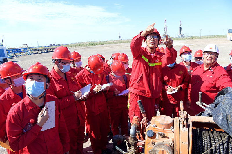 2021年7月23日,新疆克拉瑪依,中國石油大學(xué)(北京)克拉瑪依校區(qū)的9名大學(xué)生,利用暑假時間,深入瑪湖油田金龍2井區(qū)生產(chǎn)一線。