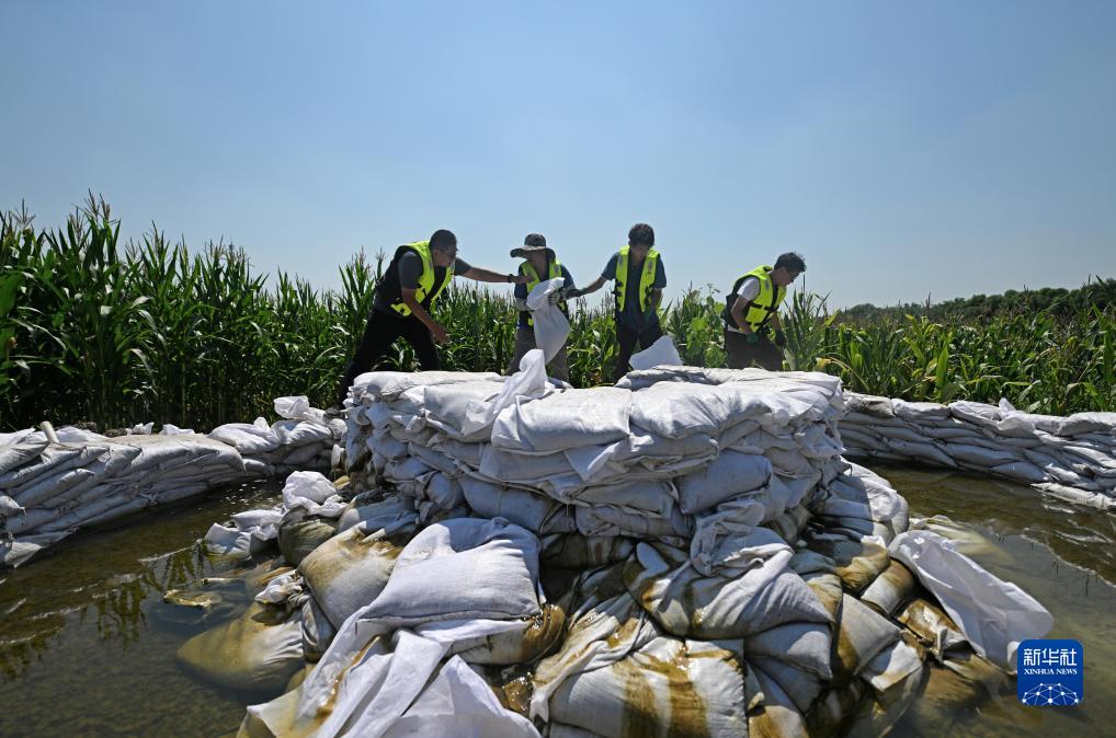 8月15日,在天津市靜海區(qū)臺(tái)頭鎮(zhèn)清北地區(qū)北圍埝附近,應(yīng)急搶險(xiǎn)隊(duì)在搬運(yùn)沙袋處置堤壩滲水。