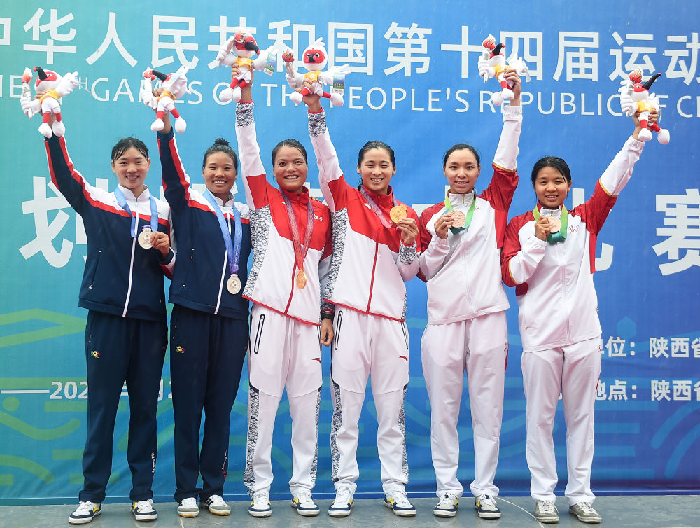 2021年9月25日,李舒琪(右一)與第十四屆全運(yùn)會(huì)皮劃艇靜水女子500米雙人劃艇決賽其他參賽選手在頒獎(jiǎng)儀式上。新華社記者 侯昭康 攝