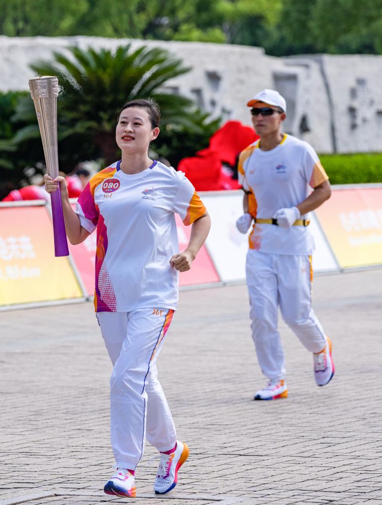 9月10日,火炬手袁晶在火炬?zhèn)鬟f中。當日,杭州亞運會火炬在浙江省嘉興傳遞。新華社記者孫非攝
