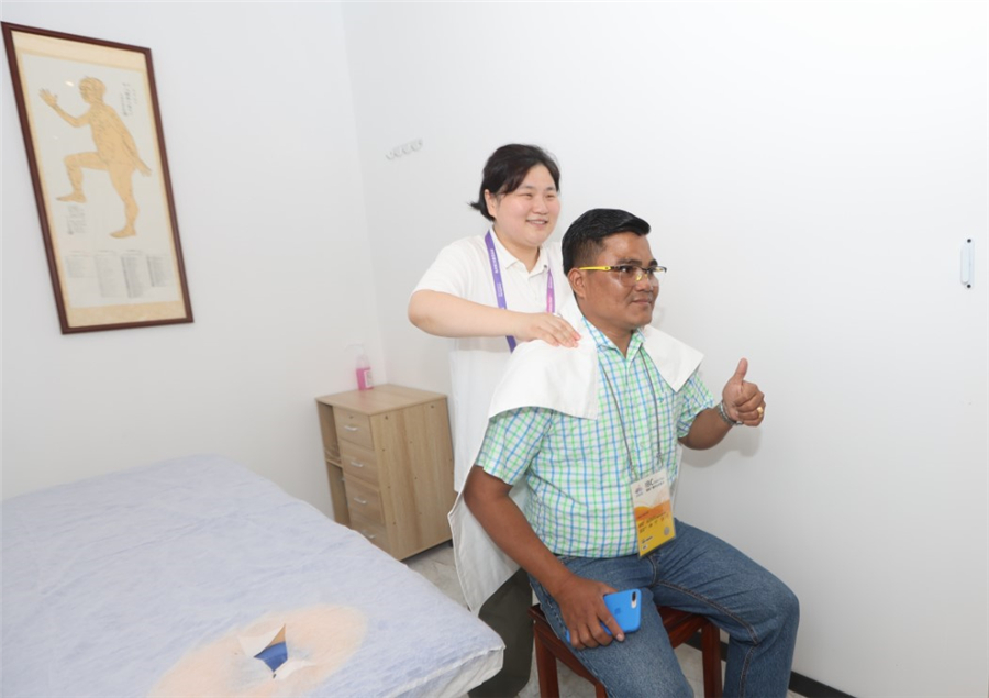在生活服務(wù)區(qū),令參訪團(tuán)成員印象頗深的是中醫(yī)藥文化體驗館,他們體驗了推拿、八段錦。這些服務(wù)深受大家歡迎和好評,不僅讓人身心得到放松,更是對中醫(yī)藥文化的一次深入了解和體驗。