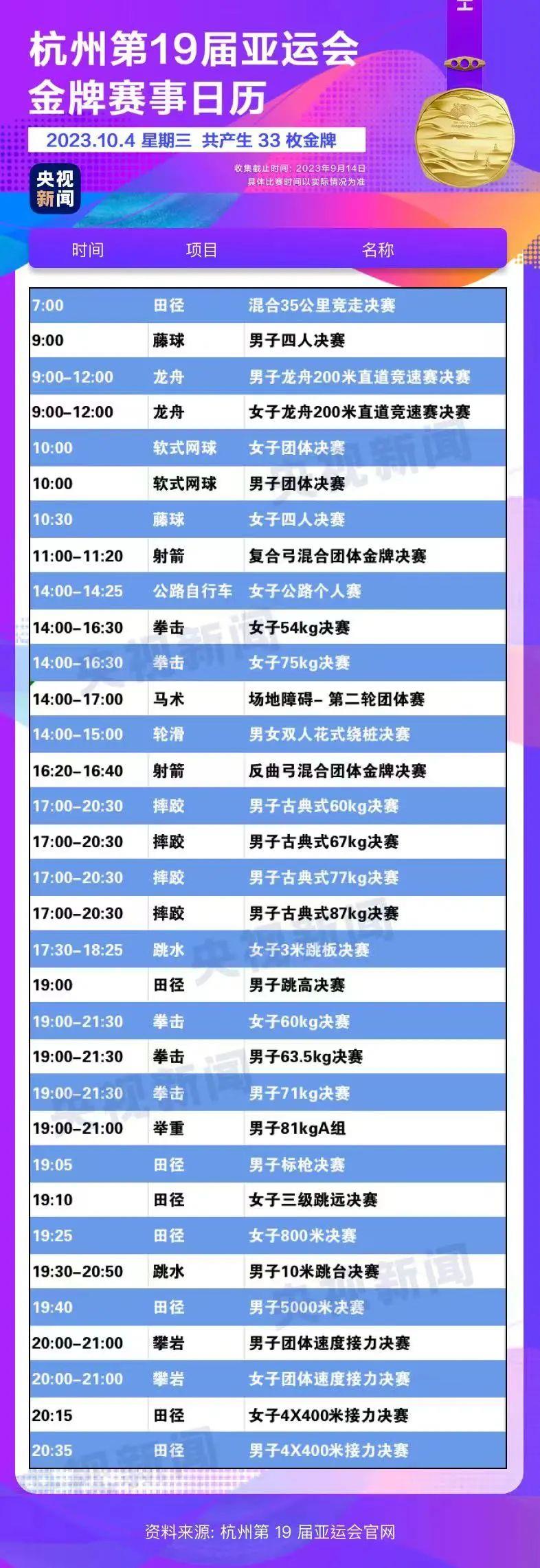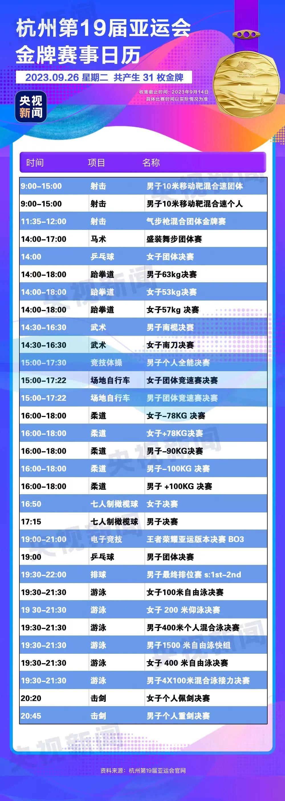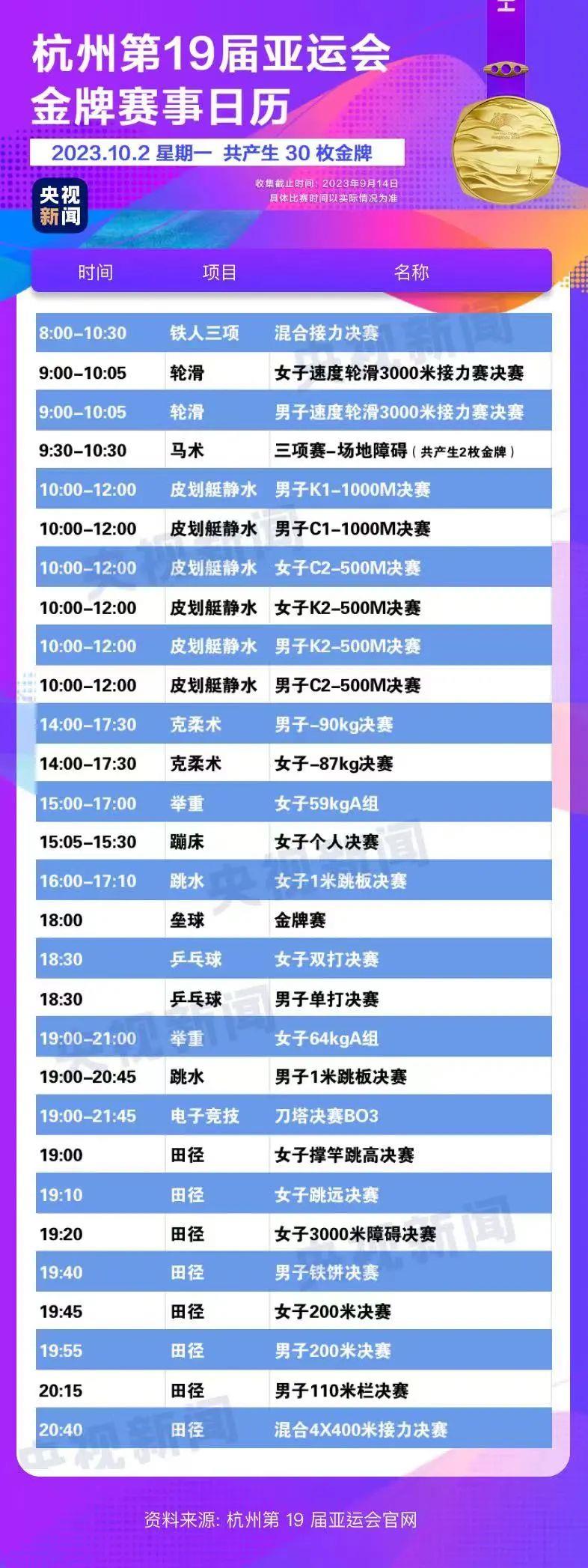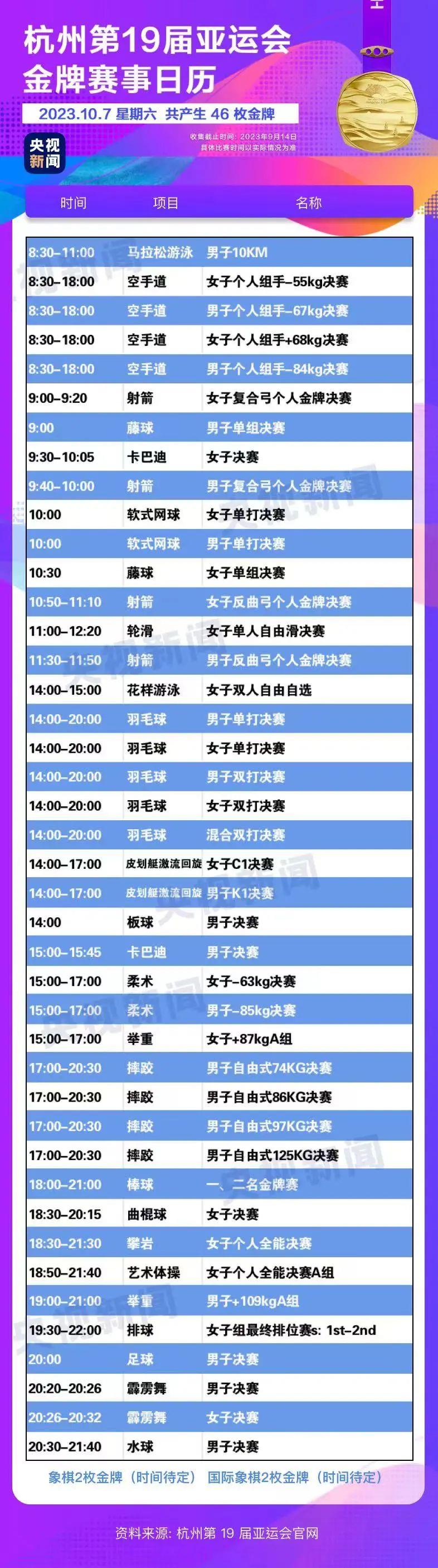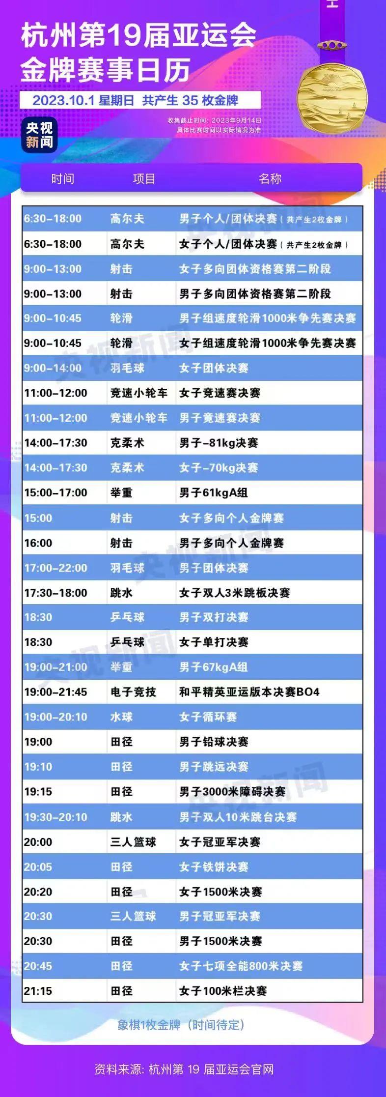 最后,小編還為你準(zhǔn)備了一份杭州亞運(yùn)會金牌賽事日歷,日歷里包含所有481枚金牌產(chǎn)生的時間?;瑒邮种福纯茨汴P(guān)注的比賽在哪天舉行。