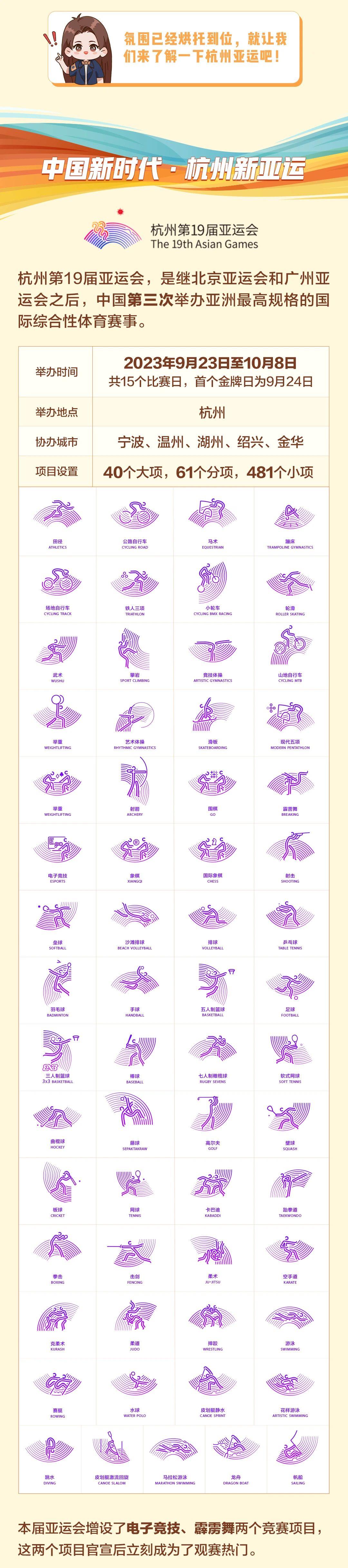 3天以后(9月23日),第19屆杭州亞運(yùn)會即將開幕。亞運(yùn)會的腳步聲越來越近,杭州的亞運(yùn)氛圍越來越濃! 亞運(yùn)會有哪些值得關(guān)注的比賽和知名運(yùn)動員?杭州舉辦的這屆盛會里,又藏著哪些“中國式浪漫”?想全面了解亞運(yùn),這份攻略,你絕對不能錯過! 接下來跟著小編一起,一圖了解杭州亞運(yùn)會吧↓