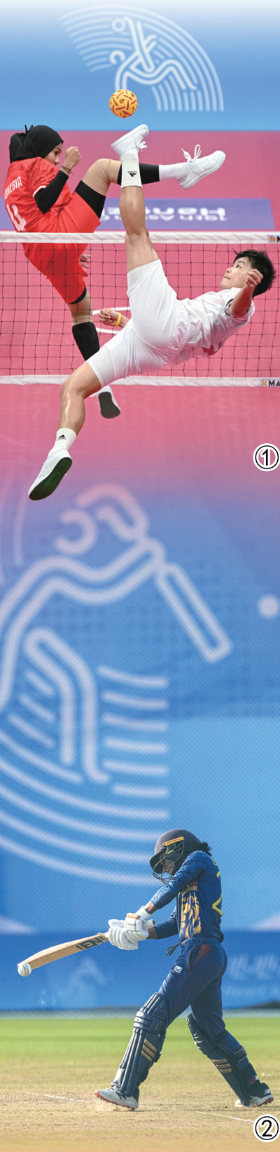 圖①:9月24日,藤球女子單組團體預(yù)選賽,泰國體育代表團選手曼立卡·汶托(前)對陣印度尼西亞體育代表團選手。 新華社記者 陳鐘昊攝