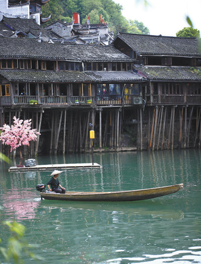 湖南湘西土家族苗族自治州鳳凰古城的吊腳樓沿沱江而建,鱗次櫛比,錯落有致。古色古香的建筑通風防潮,避暑御寒,極具工藝審美和文物研究價值。圖為鳳凰古城吊腳樓一瞥。 俄羅斯籍游客 魯?shù)履贰に緥I娜攝