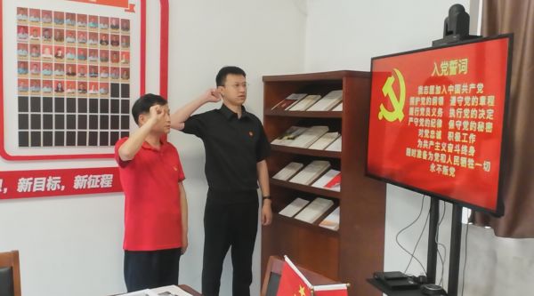 選調(diào)生劉旭暉(右)與訪談對象邱洪培共同重溫入黨誓詞