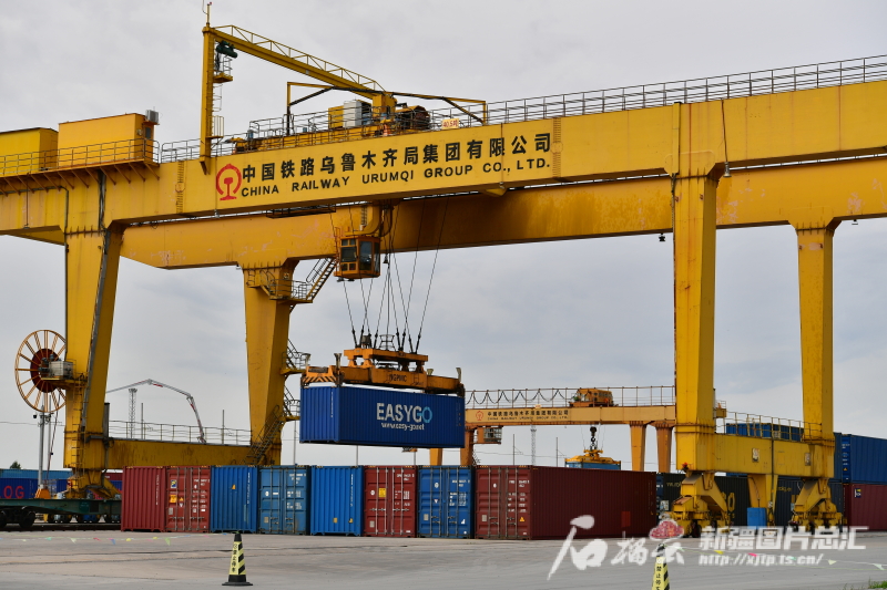 7月29日,霍爾果斯站換裝場內(nèi)堆放著數(shù)百個集裝箱,場內(nèi)兩條換裝線在同時作業(yè),6臺龍門塔吊抓起一個個集裝箱放至一旁列車上,集裝箱里裝滿了日用百貨、服裝鞋帽、電子產(chǎn)品等貨物。準(zhǔn)軌場內(nèi),已完成換裝的滿載貨物班列停在線路上整裝待發(fā)。