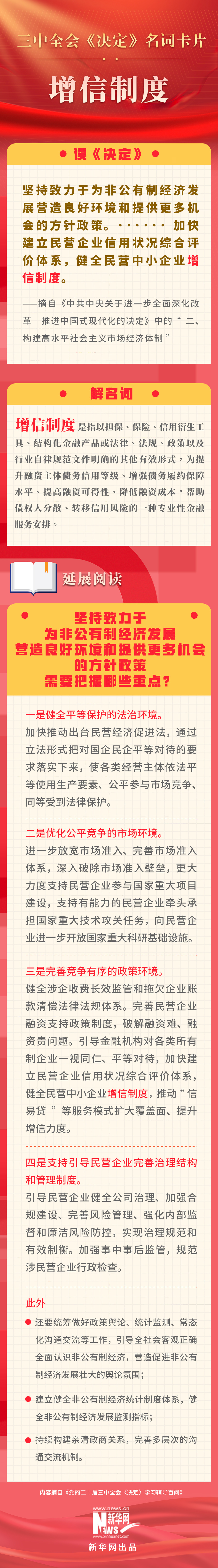 黨的二十屆三中全會(huì)審議通過了《中共中央關(guān)于進(jìn)一步全面深化改革、推進(jìn)中國式現(xiàn)代化的決定》。新華網(wǎng)依據(jù)《黨的二十屆三中全會(huì)〈決定〉學(xué)習(xí)輔導(dǎo)百問》,制作三中全會(huì)《決定》系列名詞卡片,和大家一起來深入學(xué)習(xí)領(lǐng)會(huì)二十屆三中全會(huì)精神。本期名詞是“增信制度”。