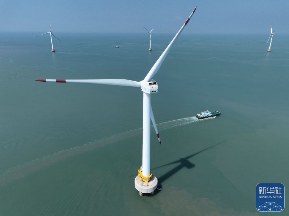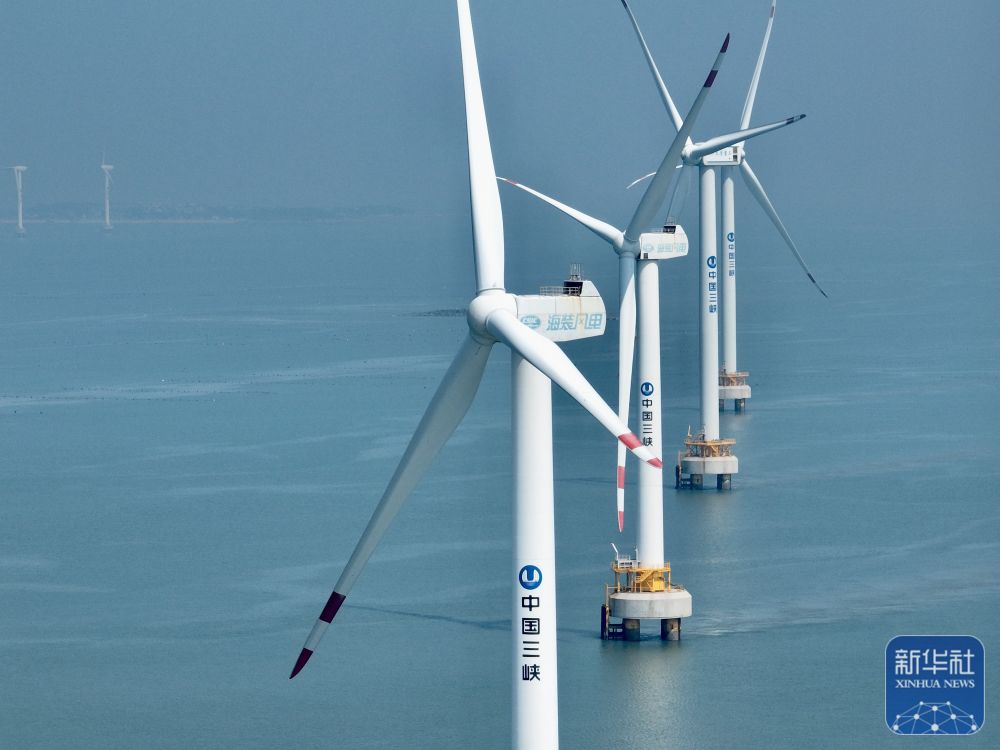 ↑這是8月8日拍攝的三峽福清興化灣海上風(fēng)電場(chǎng)(無(wú)人機(jī)照片)。福建三峽海上風(fēng)電國(guó)際產(chǎn)業(yè)園自主生產(chǎn)的部分海上風(fēng)電機(jī)組在這里裝機(jī)投產(chǎn)。