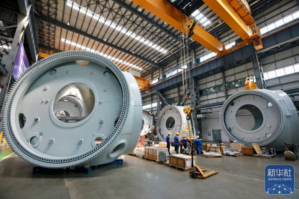↑8月8日,在福建三峽海上風(fēng)電國(guó)際產(chǎn)業(yè)園東方電氣風(fēng)電(福建)有限公司的生產(chǎn)現(xiàn)場(chǎng),工人在生產(chǎn)18兆瓦半直驅(qū)海上風(fēng)電機(jī)組。