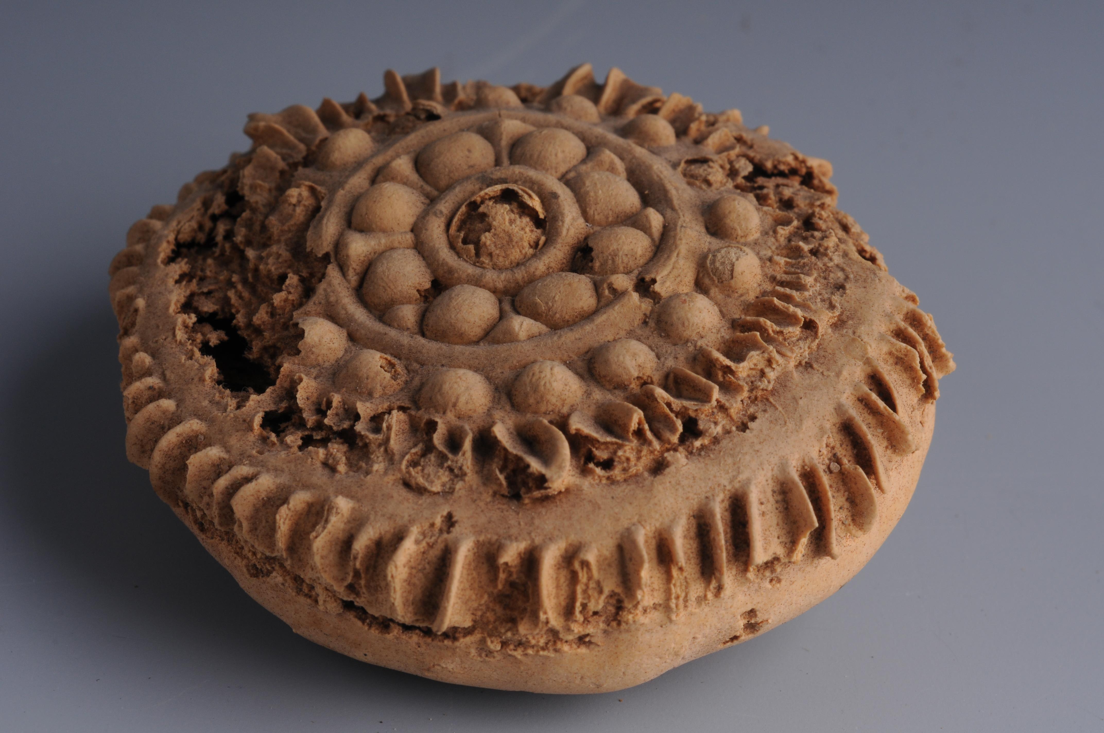 這塊寶相花月餅 出土于新疆吐魯番 是目前僅有的一件 唐代月餅式食物文物 外觀以八瓣蓮花紋為中心 每個蓮瓣間是T字紋 中間包裹住一個圓形寶珠 外圍飾有一圈聯(lián)珠紋 再往外,飾菊瓣紋